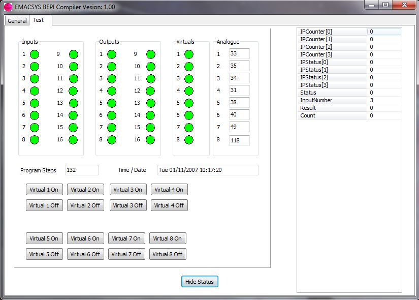 Once the program is running there are facilities to monitor variables and I/O. It is also possible to control the virtual I/O.