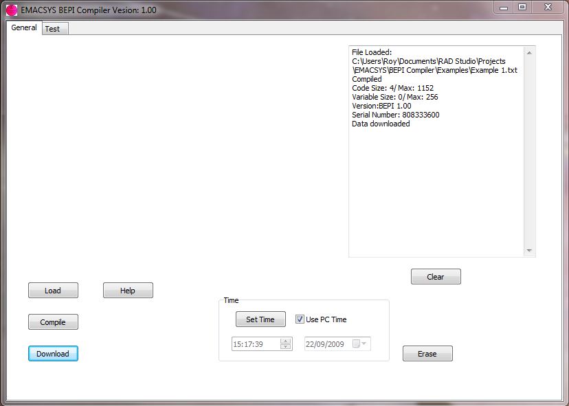 The BEPI compiler is used to compile, download and debug BEPI programs. The programs are written in an external text editor such as Notepad. They are then compiled with this application and after a successful compile they can be downloaded into the EMACSYS via the USB port.