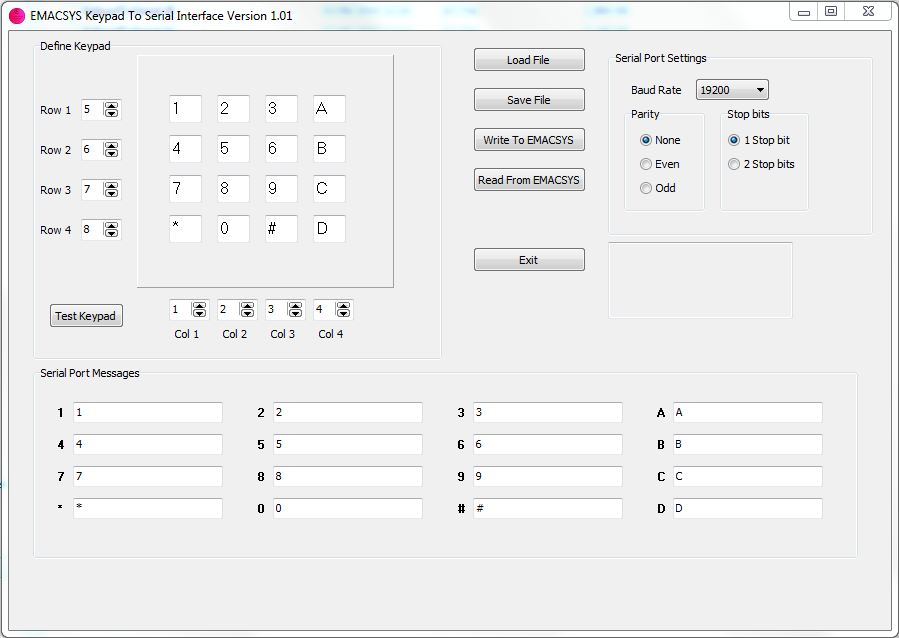 Essentially a simple application but with a host of features: Connect a keypad to the EMACSYS and in response to key strokes a serial message is sent out of the RS232 port.