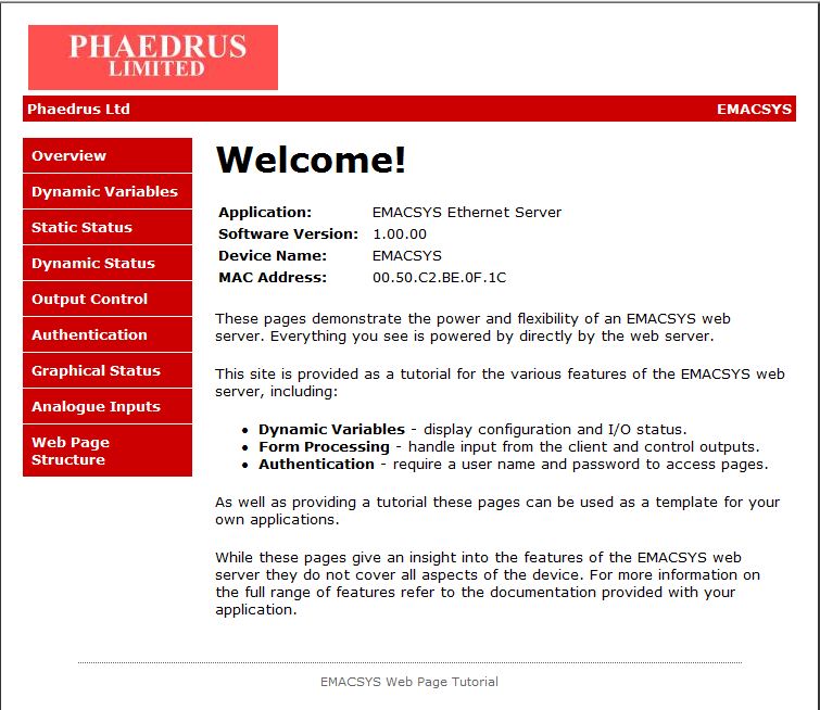 The welcome page as supplied with the appware. Note that the Software Version, Device Name and MAC Address are generated dynamically with the EMACSYS as it serves the page.