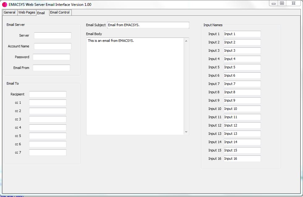 The email part of the application can send emails to 8 recipients which can be generated from any or all of the digital inputs. Each input can be programmed from the interface application to generate emails either on going active or inactive or both.