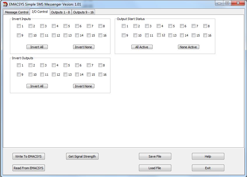 Input and output control page. Here you set the active and inactive polarity and the start status of the outputs.