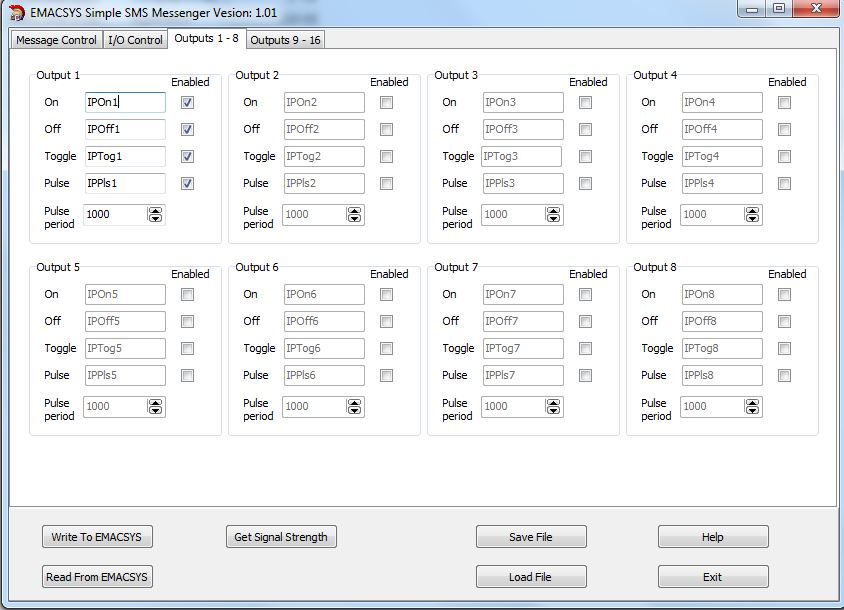 Incoming messages can be used to control outputs in a variety of ways. Outputs can be set to active, inactive, toggled or pulsed. Each action can be described with its own custom message. Any number of outputs can be controlled in a single message in any combination of actions.